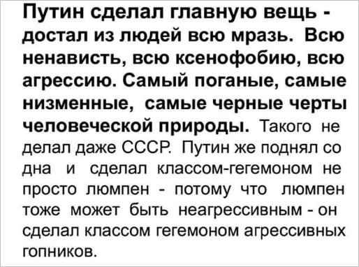 Теперь люди стали понимать, что рассказы амеров про демократию и права человека это всего лишь прикрытие их великих злодеяний. На такое разоблачение, не кто в истории, кроме Путина, не мог отважиться. |