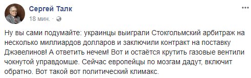 Стойкость убєждєній: "16.14 «Газпром» заявил о расторжении контрактов с «Нафтогазом», 16.33 «Нафтогаз» подписал срочный контракт с польской PGNiG, 17.45 «Укртрансгаз» предупредил ЕС о возможных проблемах с поставками газа, 18.11 «Газпром» заявил о продолжении транзита газа" |