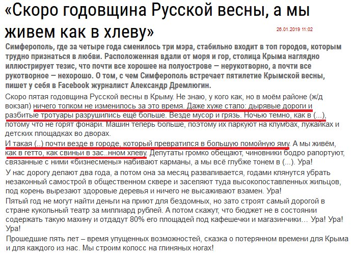 Заметили - с пропажей блаблаича тема Крыма перестала волновать местное сообщество либерастов? Одна из причин - ну нет тем и поводов. С введением в эксплуатацию жд части Крымского моста и Тавриды начнётся полное восстановление похереной уркаиной инфраструктуры Крыма.