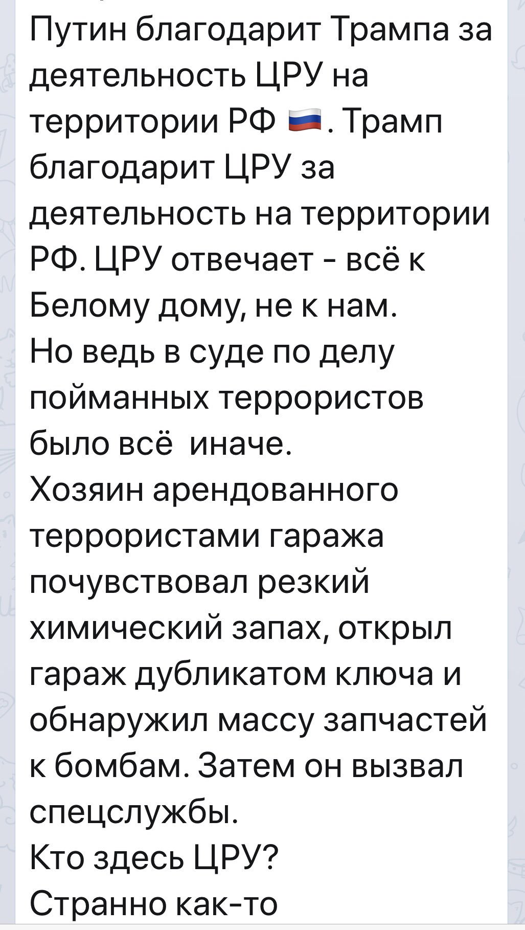 Для придурков, ведь все же элементарно. ЦРУ готовит террористов, готовит херово, потому что повальная коррупция, террористы изза плохой подготовки палятся по хухне. Вот поэтому мы и благодарим ЦРУ. Хотя, есть версия, что ЦРУ на треть, это российские агенты, их то мы и благодарим.